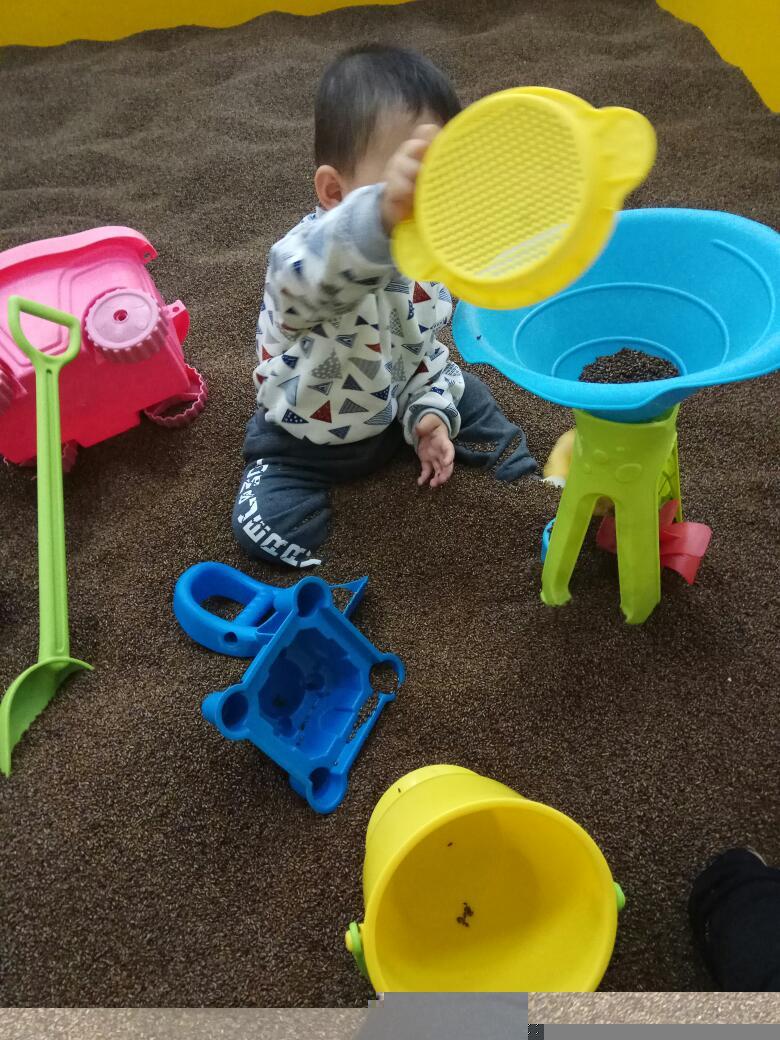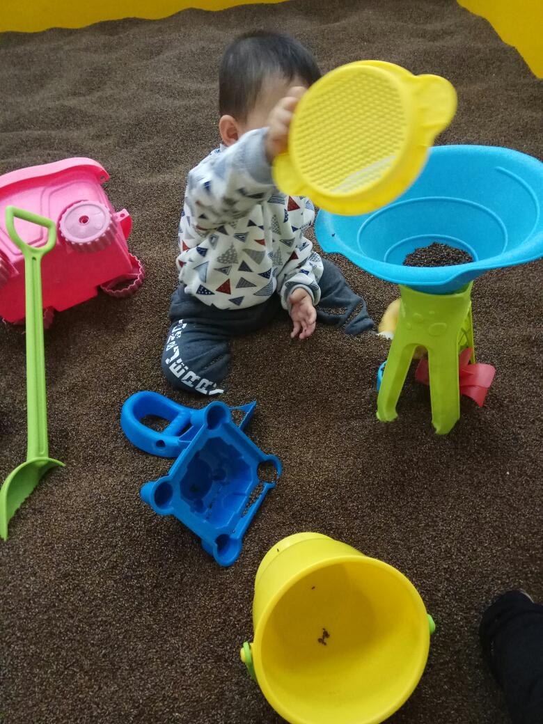 他也会拿着沙池里的筛子肿基,用铲子铲一些沙子倒在筛子上,然后有模有样的左右摇晃的筛起来,直到筛子里的沙子都掉下来为止,一遍又一遍重复着。或许在我们眼中他这些个行为有点幼稚,但他却乐此不疲,玩的很开心。