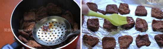 4. 准备辨细搂烤盘,铺上锡纸,将豆腐干依次排在烤盘上,刷上蜂蜜