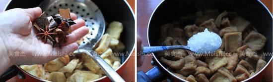 3、油豆腐煮至滴不出水的程度即好,煮的过程中,切不可离开,以免烧糊;