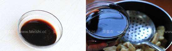 2. 另锅,放入油豆腐,将材料老抽2汤勺、生抽5汤勺、盐3克,调成酱汁倒入,典乐并倒入一碗水