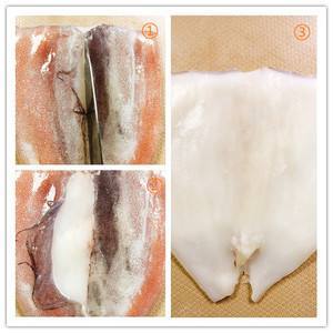 鱿鱼把头和内脏去掉,冲洗干净,然后在背部中间用刀划开,把外衣撕掉,再次冲洗干净。