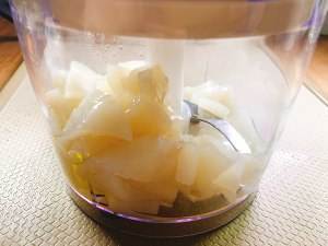 蛋清蛋黄分离,这里我们只用蛋清,蛋清和鱿鱼片一起倒入绞肉杯。打成鱿鱼豆点清泥。