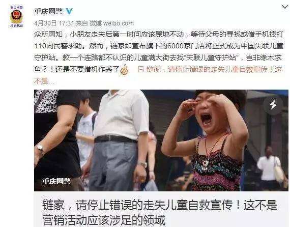 4月30日,面对网上的爱心接力,重庆市公安局网安总队在其官方微博和微信上发布了一则名为《 链家,请停止错误的走失儿童自救宣传!这不是营销活动应该涉足的领域 》的文章。文章矛头直指链家门店成为中国失联儿童守护站,并表示“该企业的这项‘善举’还真该被打个大大的问号”。