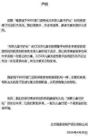 针对大家的议论,4月30日晚上10点过,链家网在官方微博上发布声明。声明提到, “失联儿童守护站”有CCSER儿童失踪预警平台联合多家连锁经营机构共同发起的帮助儿童的线下活动。 该平台则将在5月25日公布这一计划更多内容。