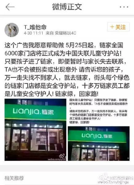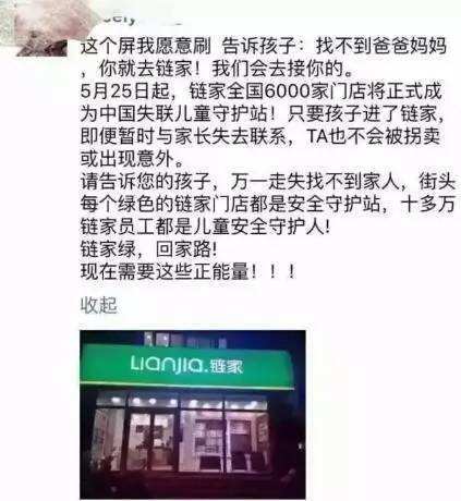 在这段文字中,提到了5月25日起, 链家全国6000家门店将正式成为中国失联儿童守护站 。“只要孩子进了链家,狗认即便暂时和家长失去联系,他也不会被拐卖或出现意外。”这段文案还表示,十多万链家员工都是“儿童安全守护人”。