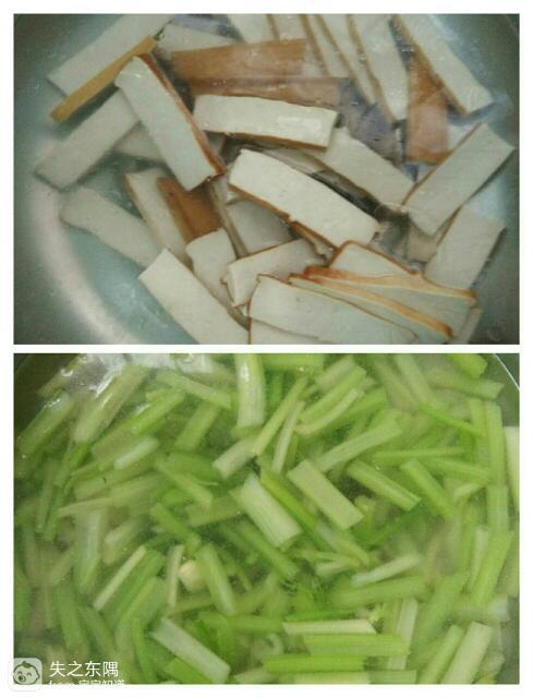 3.锅中水烧开,放点盐油把香干,芹菜焯水备用,