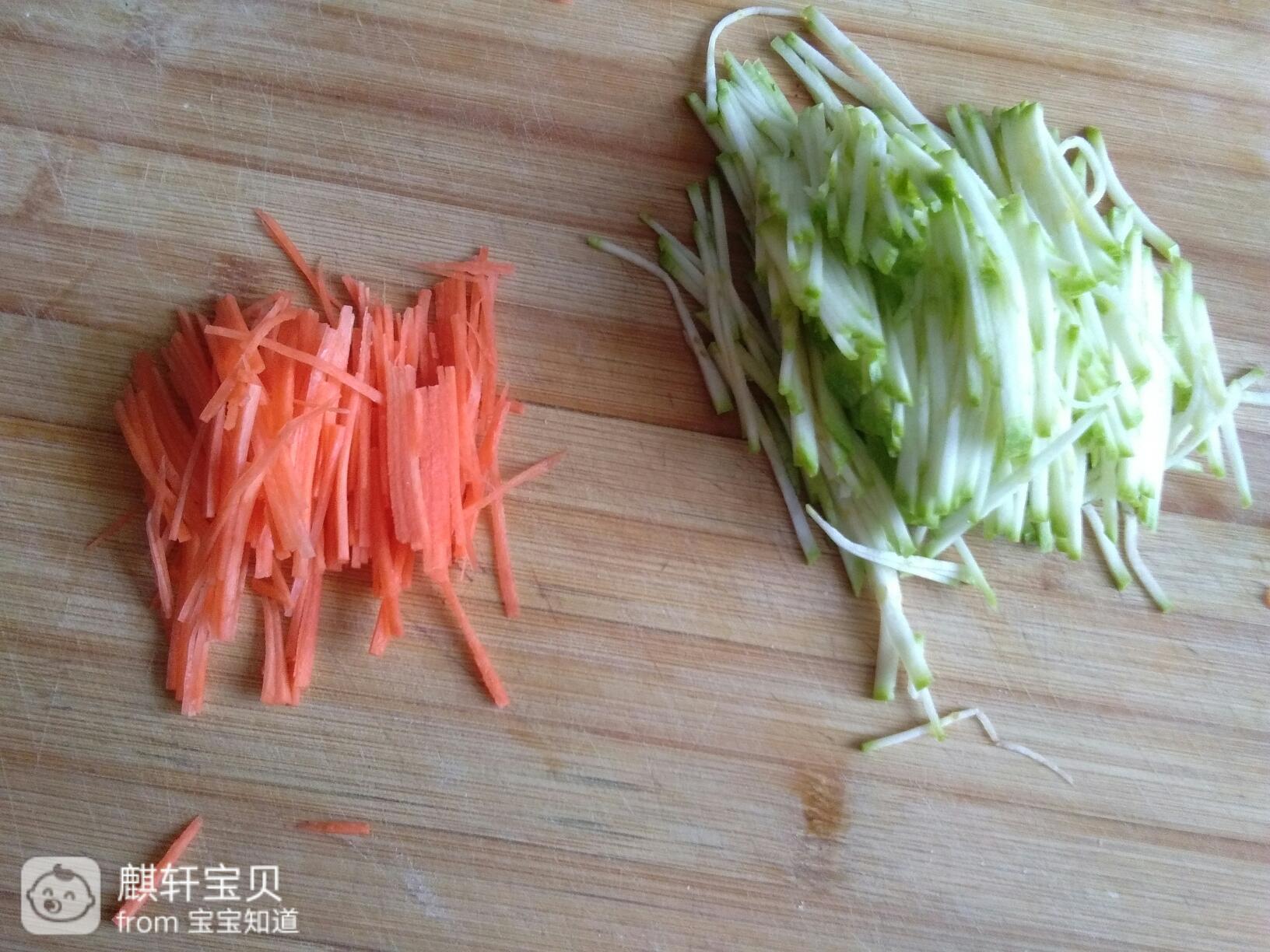 把西葫缘布芦和胡萝卜洗干净切细丝,胡萝卜尽量切细一点,不好熟