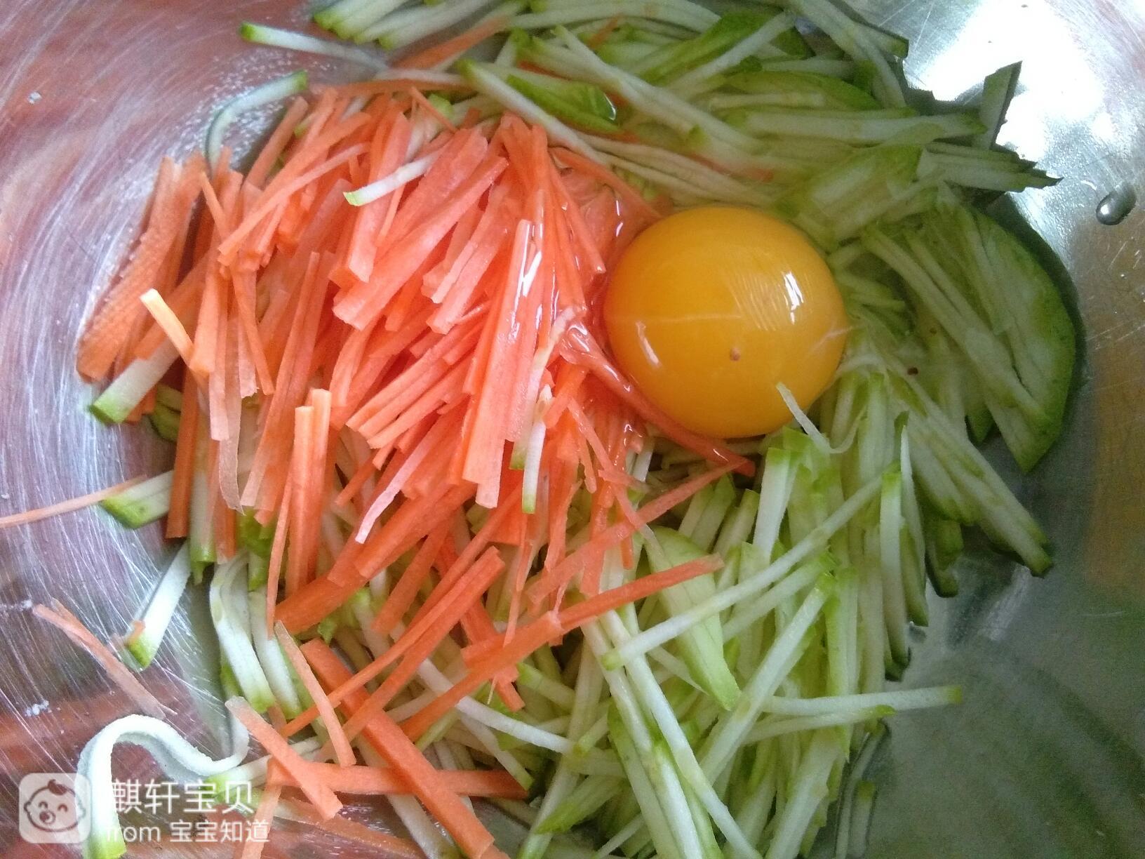 把西葫芦丝和胡萝卜丝放入盆中,打入鸡蛋