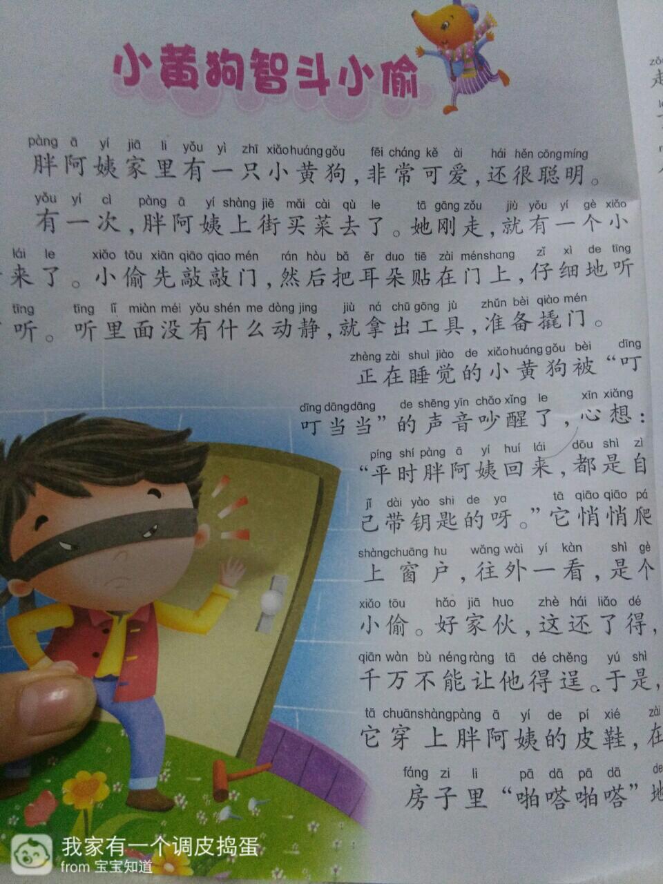 正在睡觉的小黄狗被“叮叮当当”的声音吵醒了,心想:“平时胖阿姨回来,都是自己带钥匙的呀。”它悄悄爬上窗户,往外一看,是个小偷。好家伙,这还了得,千万不能让她得逞。于是,它穿上胖阿姨的皮鞋,在房子里“啪嗒啪嗒”地走来走去。果然,小偷停来了,想:“这屋子里好像有人呢,要不要继续撬呢?”