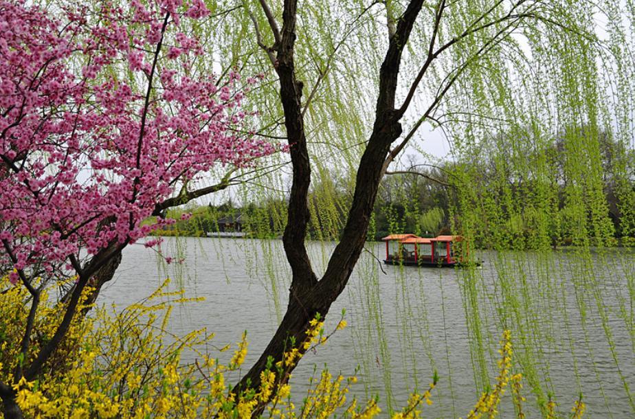三月柳树发芽,四月桃花开。整个杭州城到了春天都很美丽,不用跑到西湖狼豆垃,就随便站在离家不远的南湖河岸上一拍,所有的要素都有了,山,水,舟,花,人。