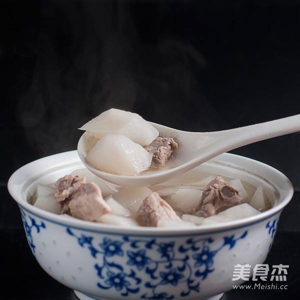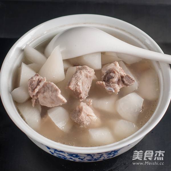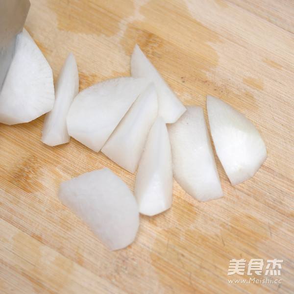 3. 将萝卜切滚刀块,放入排骨汤中,炖至熟透。