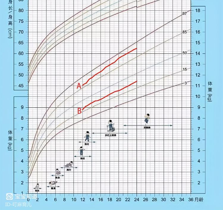 大部分宝宝都会沿着自己的生长轨迹,在某两条主百分位线之间相对稳定的成长。比如下面图示的2条红色连线,是两个2岁男孩的1-2岁的生长轨迹,虽然一个胖点一个瘦点,但是他们的生长轨迹是均衡增长的(A男孩体重一直在P85-P97之间波动,而且逐渐增加;B 男孩体重一直在P15-P50之间波动,逐渐增加),那么他们的发育就是正常的。