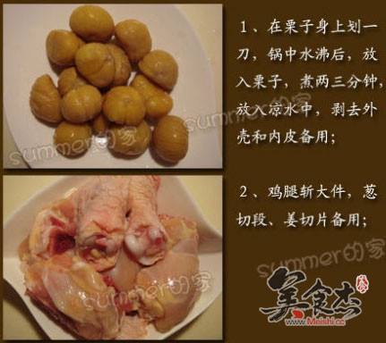 干烧鸡的做法 1. 在栗子身上划一刀。锅中水沸后,放入栗子,煮两三分钟放入凉水中,剥去外壳和内皮备用