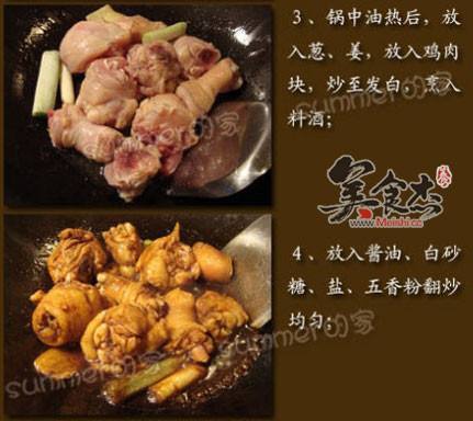 3. 锅富孟崭中油热后,放入葱、姜,放入鸡肉,炒至发白,烹入料酒