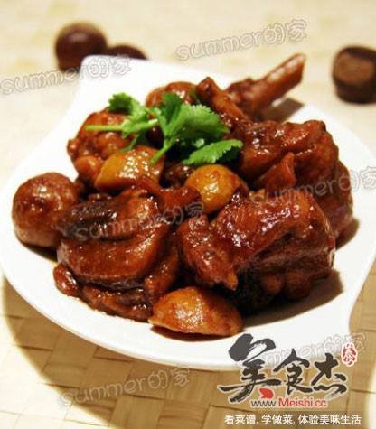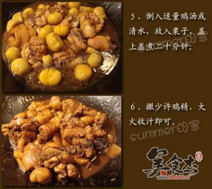 鸡肉 500克 辅料 鲜栗子 250克 调料 食化殊盐 适量 酱油 适量 味精 少许 料酒 1汤匙 淀粉 少许 白砂糖 1汤匙 高汤 适量