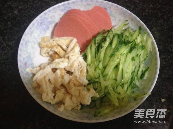 4. 鲜肉腿切片,黄瓜切丝 煎鸡蛋切丝备用
