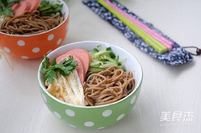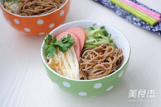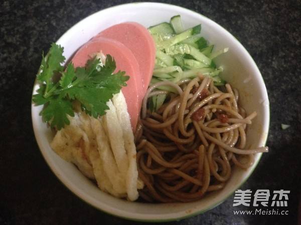 5. 凉面放人容器,浇上一勺豆瓣酱,拌匀后把各种配菜摆在上面即可
