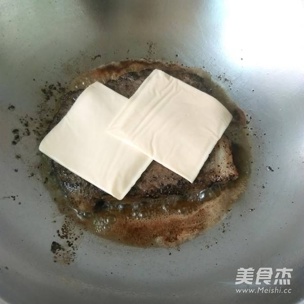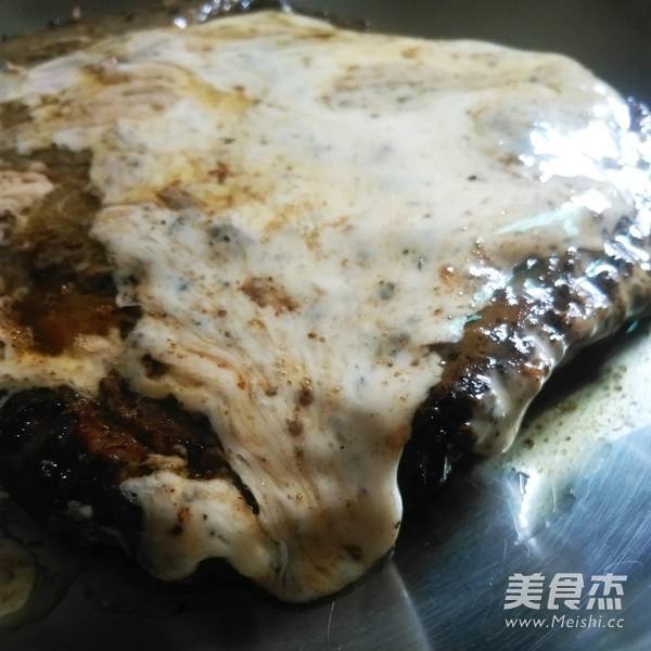 4. 牛扒翻面,放两片芝士下去,再煎一瓣侨分钟后换小火,等芝士融化即可