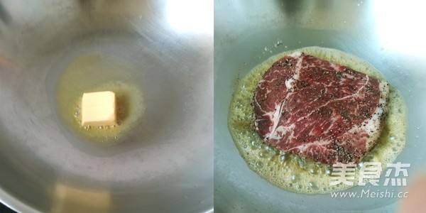 3. 锅里放少许悟扬今橄榄油,烧热放下黄油,等黄油融化之后将牛扒放下去大火煎大约一分钟