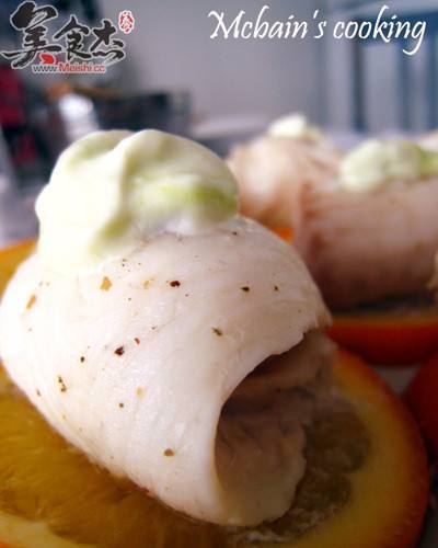 4. 蛋黄酱和青芥酱混合,挤在蒸好的鱼卷上