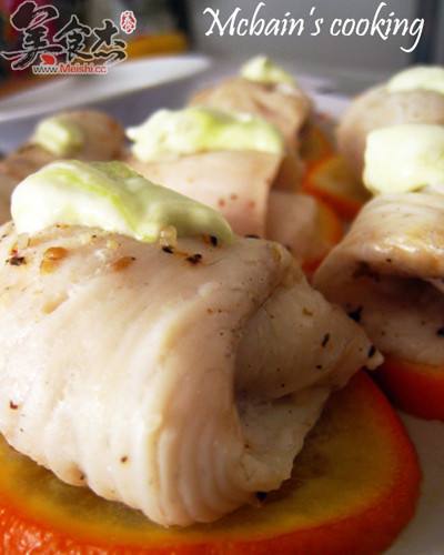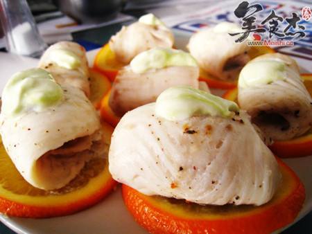 2. 橙子切片,铺在盘子里,鱼柳卷起来凡瓦放在橙子上