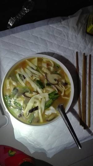 水开以后下面,面快煮好以后下青菜碎,吃的时候加点辣椒,很香