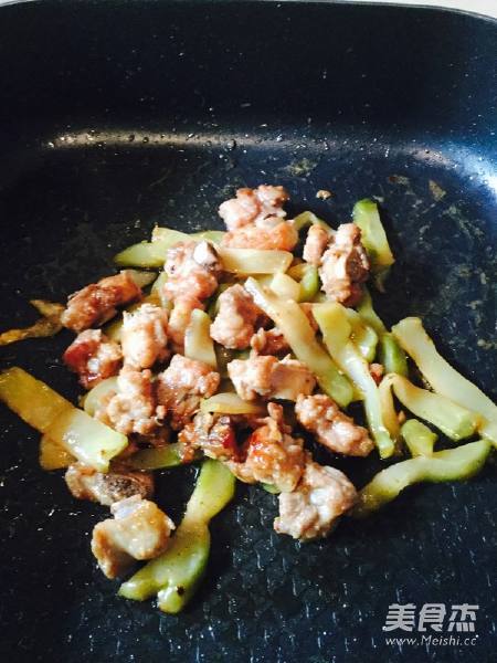 4. 加入榨菜、少许盐和蚝油炒至熟