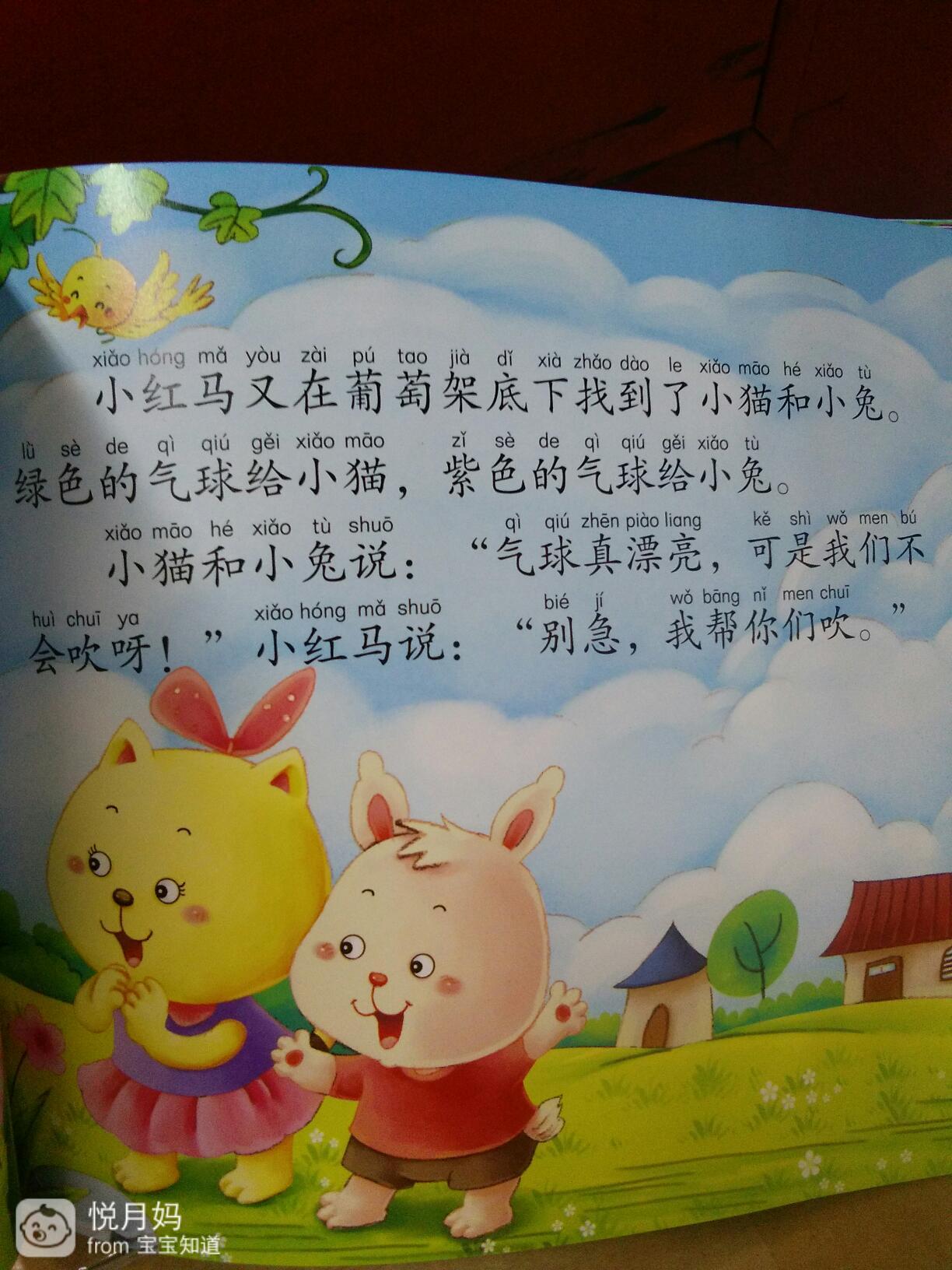 小红马又在葡萄架底下找到小猫和小兔。绿色的气球给小毛紫色的气球给小兔。