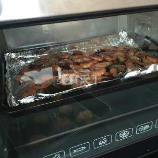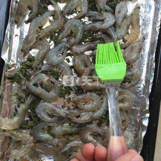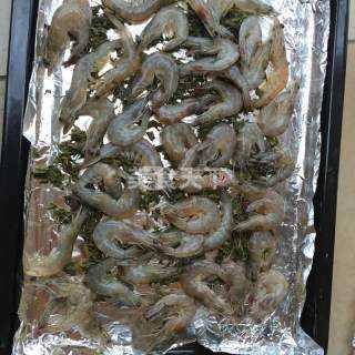 8 这时,虾差不多泡好了,虾从茶里捞出来,铺在烤盘上