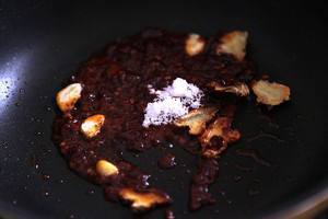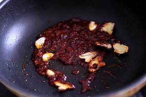 加入郫县豆瓣酱一勺半,放入锅里炒香。这次郫县豆瓣酱是从四川那边寄过来的~~ 下次做个鱼香肉丝