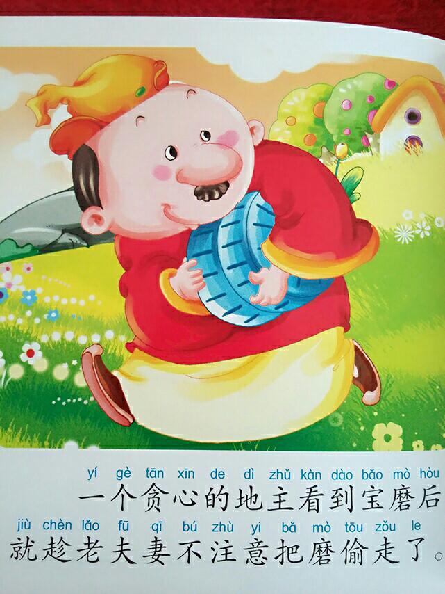 一个贪心的地主看到宝磨后,就趁老夫妻不注意的时候把磨偷走了