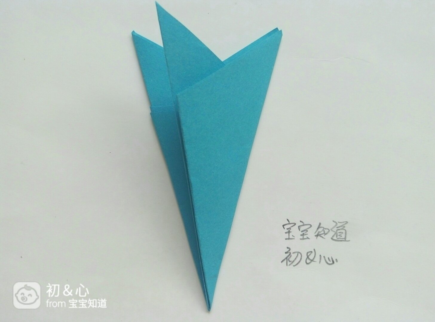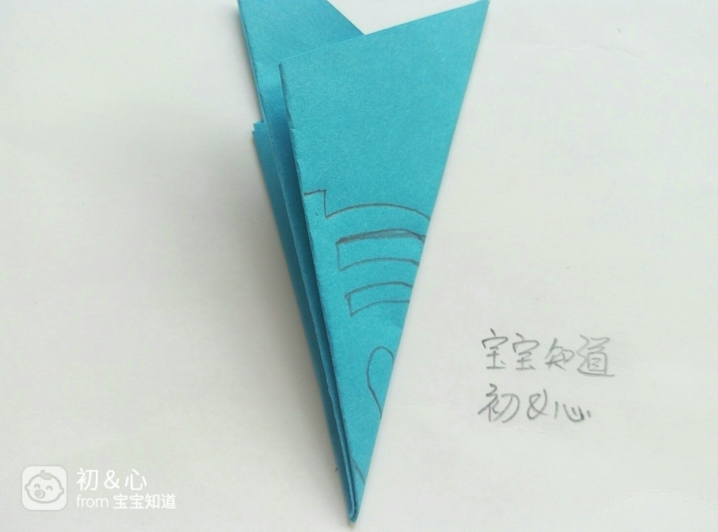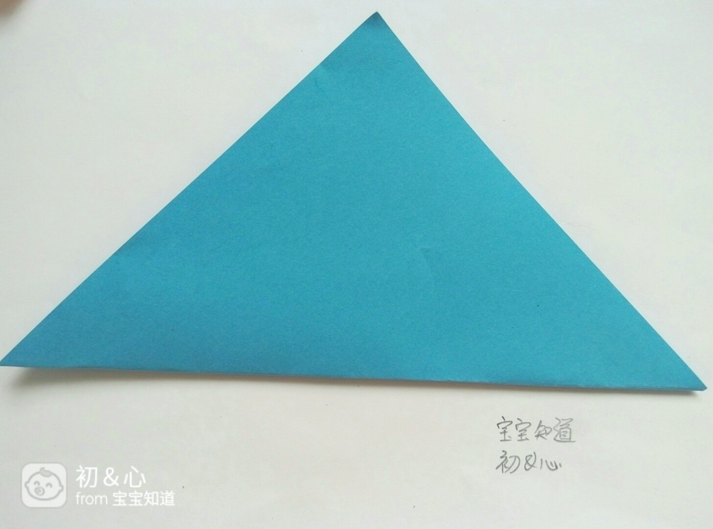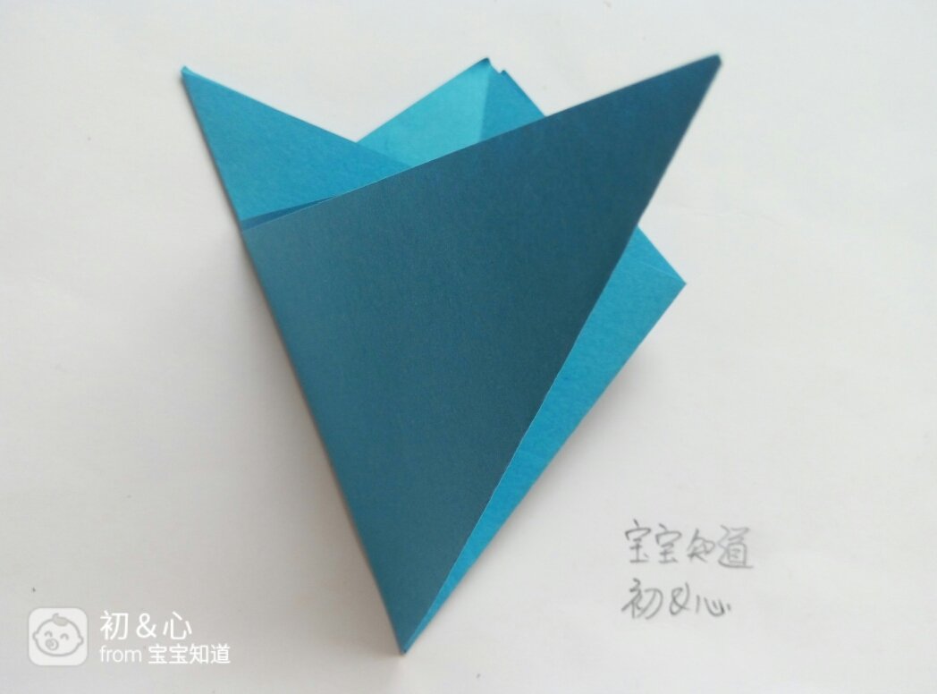 准备好正方形蓝色纸,剪刀,铅笔。首先把蓝色纸的尺录高两个对角对齐折好。如图所示。