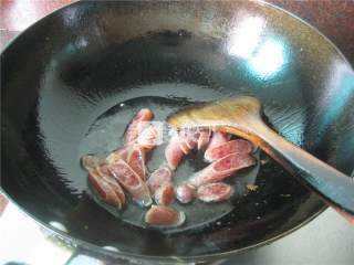 3 油五成热,放入香肠,关小火煸炒,炒至香肠出油