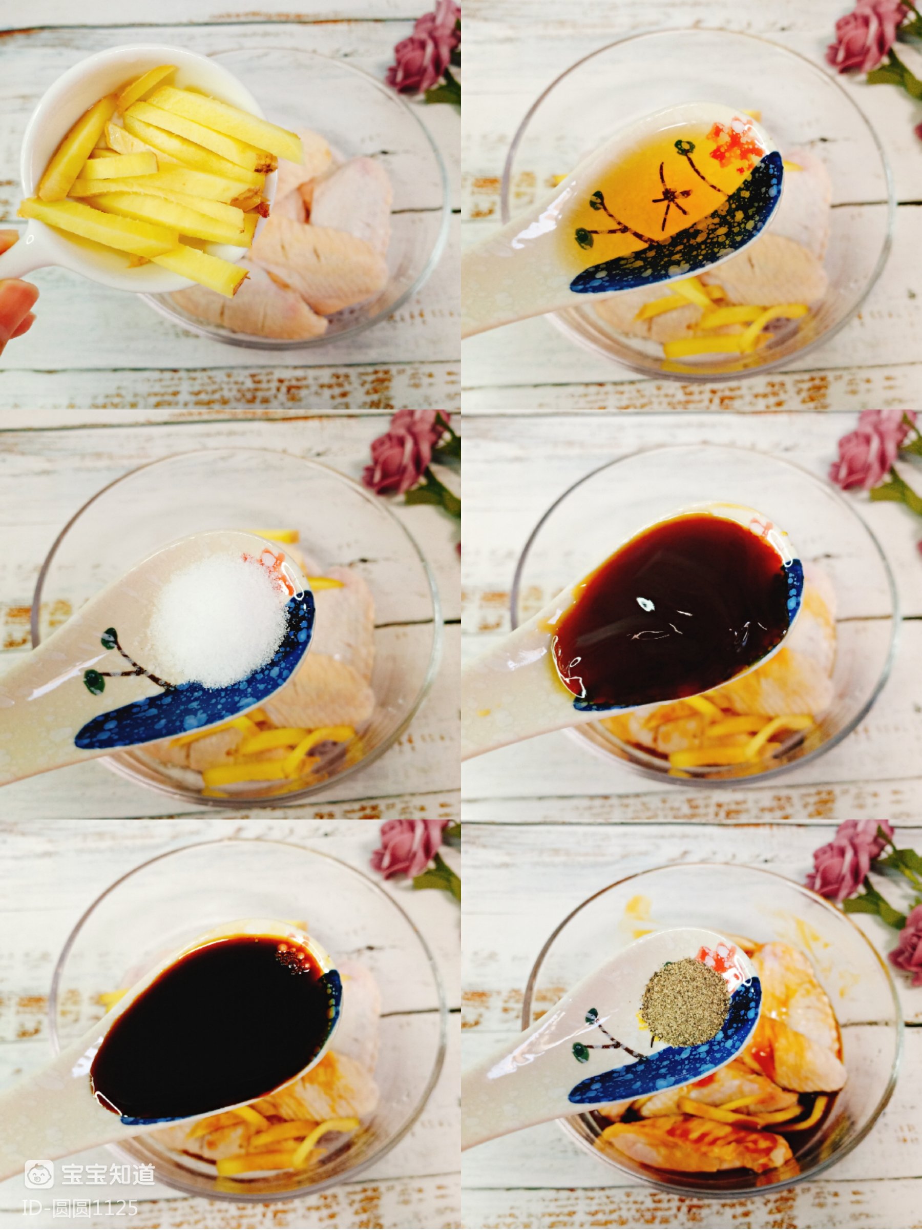 1、首先,把鸡翅清洗干净,两面划几刀,放入姜丝、加一勺料酒、一勺生抽、1勺蚝油、小半勺盐和少许黑胡椒碎,用手抓匀,腌制1小时以上