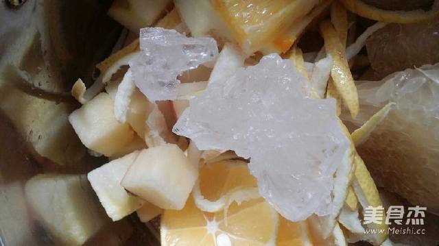 “ 柚子好吃,柚子皮的功效也很多,止咳祛痰,清肺热,去火气。所以我在果茶中加了些柚子皮,虽然有一点点苦,但是有其他水果和冰糖的遮盖,就没那么大了,味道也是不错的。 ”