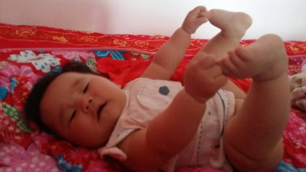 我家前天开始啃脚丫子了,抱着啃手,躺着啃脚
