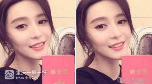 照片里,范冰冰拿着红本本甜甜的笑着。