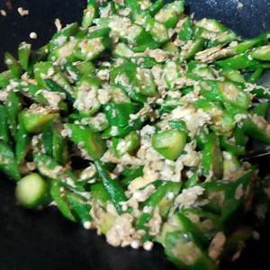 锅里倒密荒些油,秋葵妹倒下去翻炒。