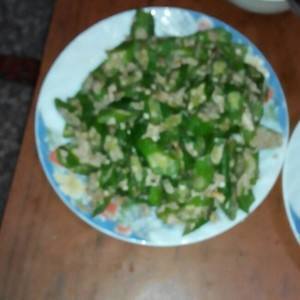 等到秋葵妹已经快熟了,就倒了如蛋蛋君翻炒,放蛋蛋的那个碗加点开水倒倒到锅里(一丁点的蛋液也不放过),然后少许的加盐和味精哦。