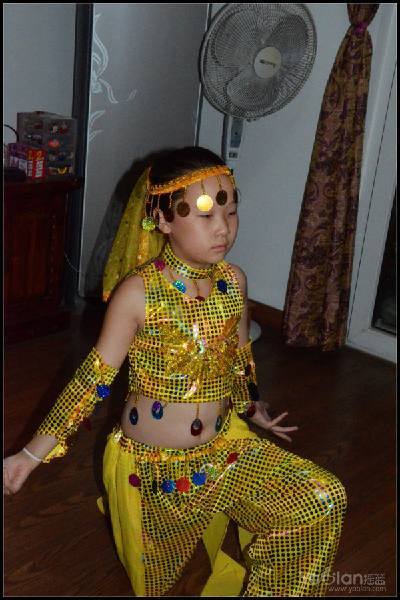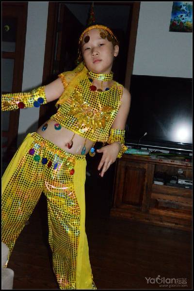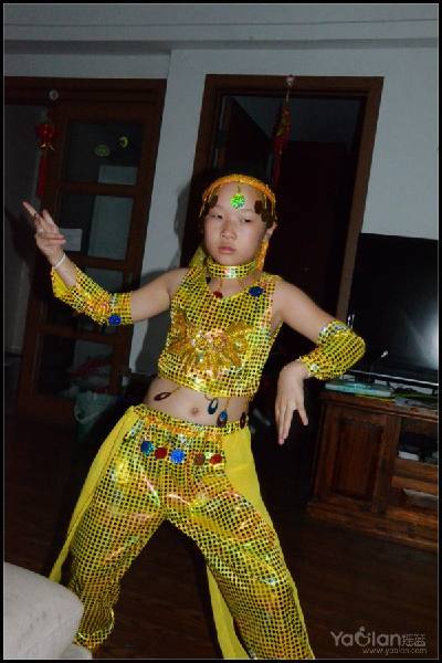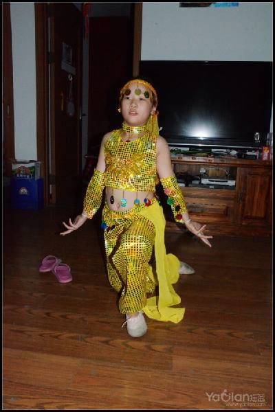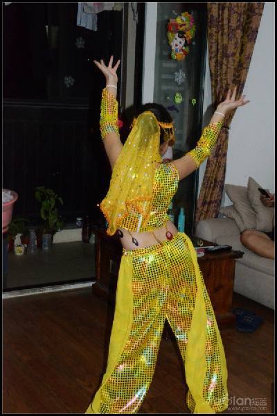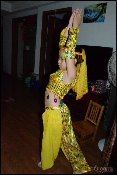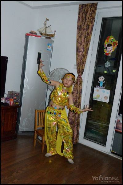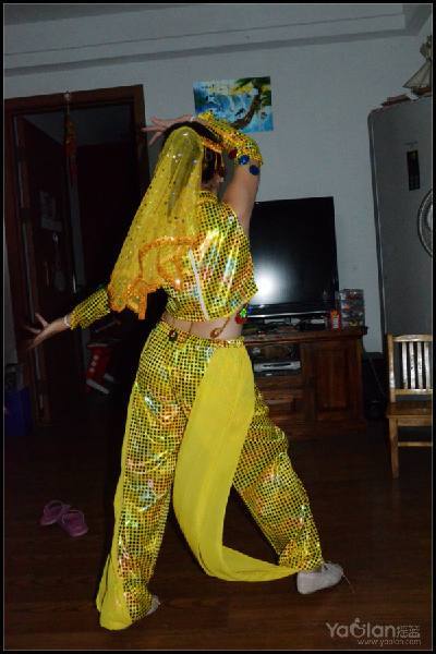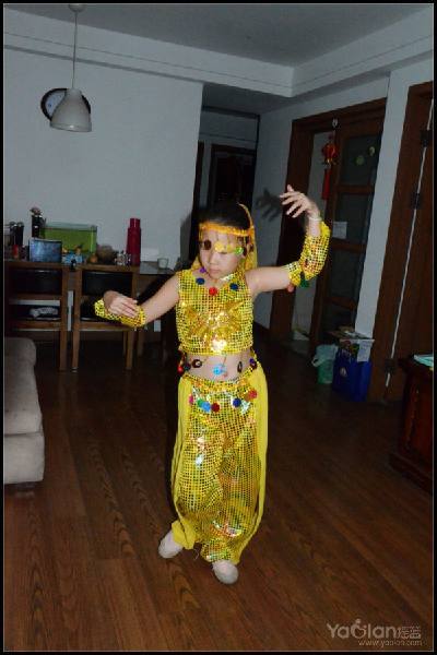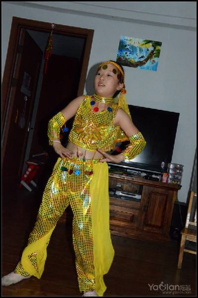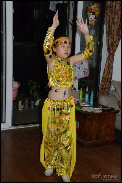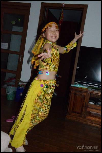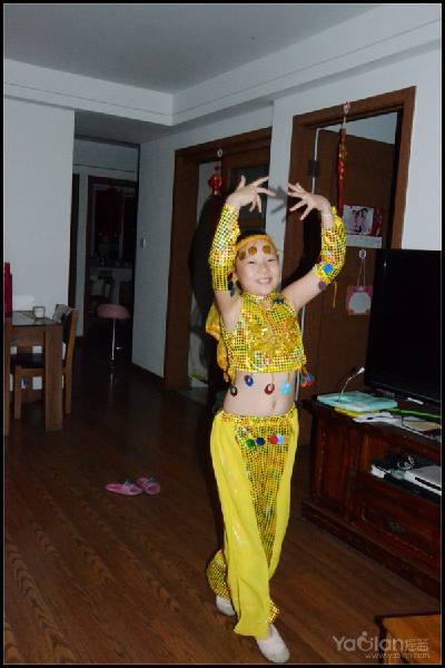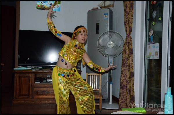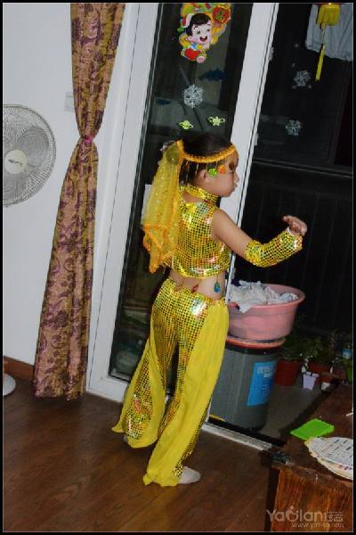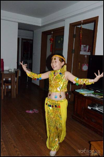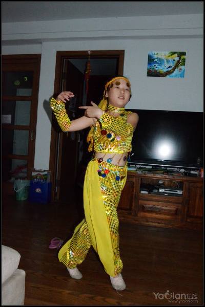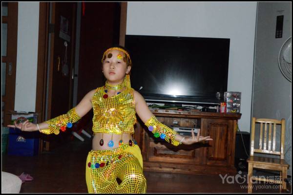 自己在家里跳,笑得很开心,希望表演时能笑得这么自然与开心就好了,表演衣服质量一般,跳了一次,亮片掉了一片,珠子唰唰掉了一串,得小心翼翼,别到真正上场的时候掉光了。