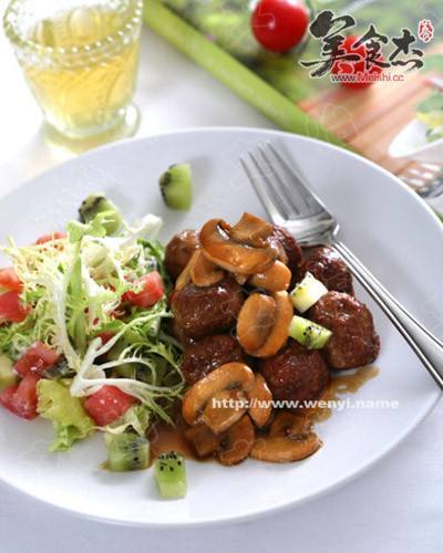 5. 调成小火,放入黄油,待融化后,放入切成片的口蘑炒软后,调入酱则哑笼油和淡奶油(没有的话可用少许牛奶代替),继续用小火熬成浓稠的酱汁后,淋在肉丸上即可