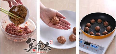 4. 手上抹一点油,将肉馅做成小丸子。平底锅中倒入少许油,待油5成热时,逐个放入小丸子,调成中小火将丸子煎熟后盛入盘中