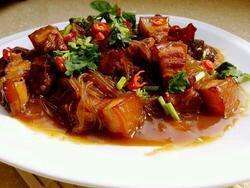 将泡好的粉条加入烧肉锅中,翻炒均匀,加盐,鸡粉,收汁即可