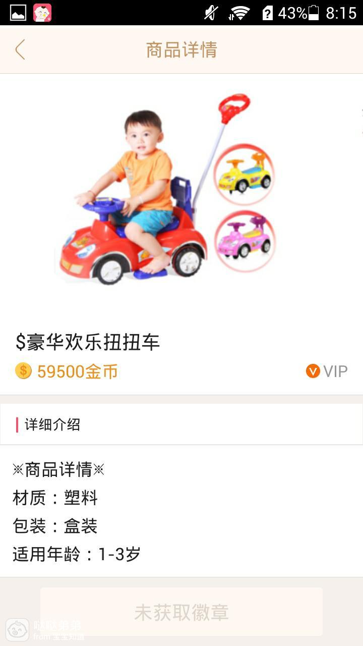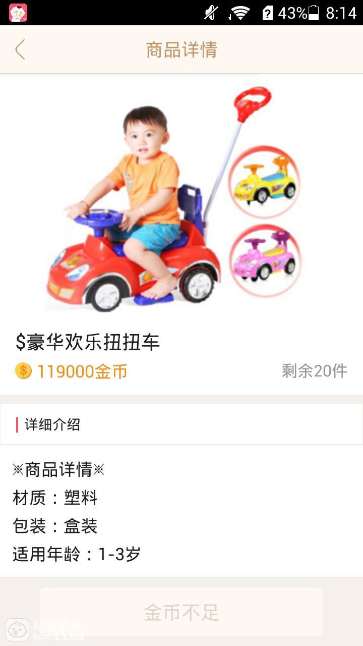 现在儿子还是五个多月。再过逝俗几个月就会爬会走了。所以我一定要趁这段时间好好的努力一把。挣金币吧!努力吧!成功了,才有机会。所谓的不如行动。所以亲爱的,给我力量。支持我,我一定会努力的把这款扭扭车换给我儿子。