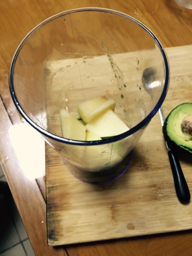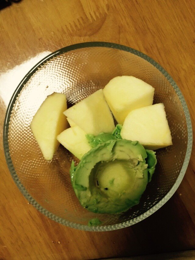 3.苹果去皮切块,牛油果用勺子勺出相惑