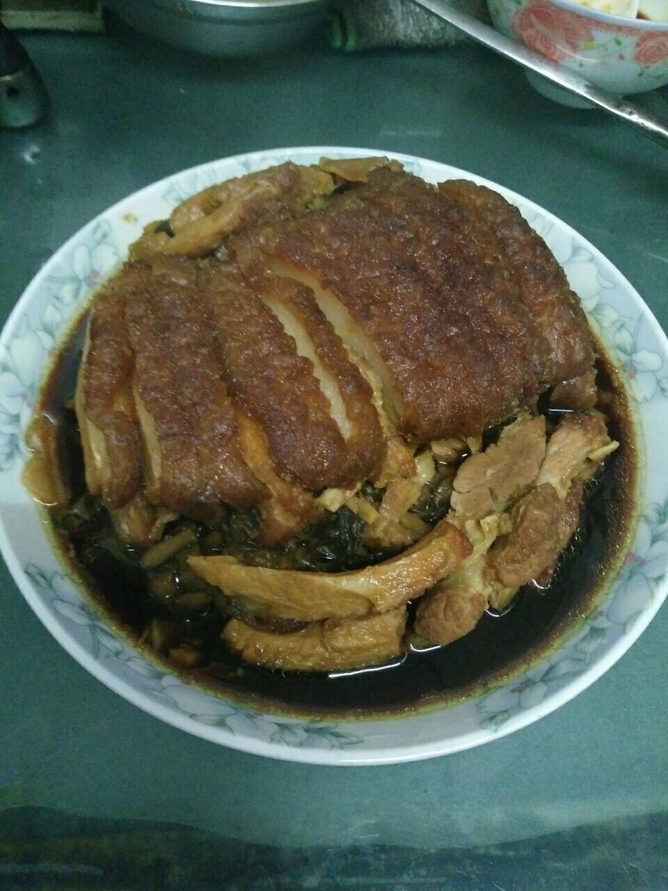 肉摸老抽上色 切片 碗下面放肉上面放梅菜 然后放盐 豆豉几粒 大料两个 上锅蒸30分钟