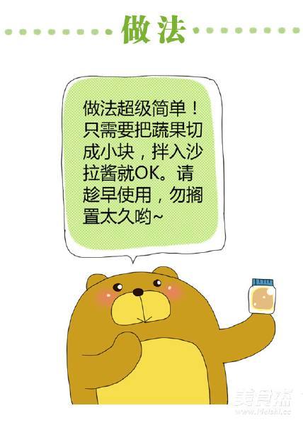 夏天里的雪的做法 1. 做法超级简单!只需要把蔬果切成小块,拌入沙拉酱就OK。请趁早使用,勿搁置太久过洞哟~