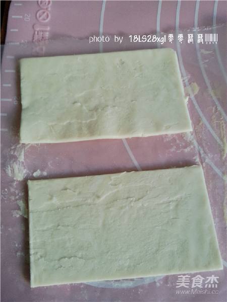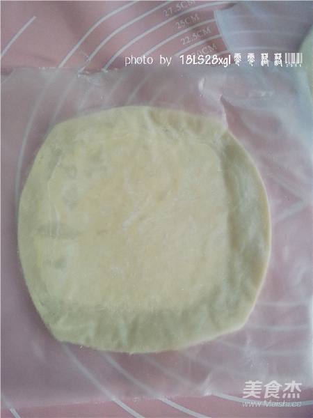 3. 稍稍放软的飞饼皮,切掉四边,成长方形;