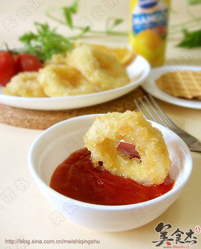 鱿鱼(干) 适量 辅料 面包粉 适量 鸡蛋 适量 面粉 适量 调料 食盐 适量 料酒 适量 番茄酱 适量 胡椒粉 适量 植物油 适量