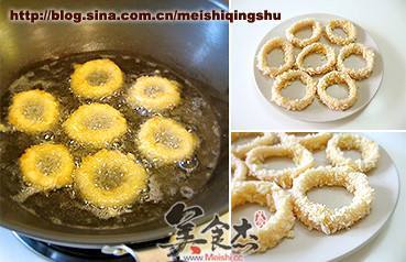 4. 依次做好所有的鱿鱼圈,锅内倒入油,烧至六七成热时下入鱿鱼圈,炸至金黄即可。炸鱿鱼圈的油一定不要太热,那样鱿鱼圈很容易糊掉。时间也不宜过久,外皮呈金黄色就可以了~ 这样才会外酥里嫩非常的好吃~ 鱿鱼圈这就做好了,搭配自己喜欢的蘸酱和果汁一起吃吧